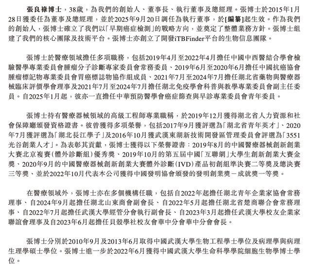 其中,张良禄博士,38岁,为公司创始人、董事长、执行董事及总经理。张良禄于2015年1月 28日获委任为董事及总经理,并于2025年9月20日调任为执行董事。作为公司的创始人,张良禄确立了以“早期癌症检测”的战略方向,并奠定了整体业务方针。张良禄组建了公司的核心团队及技术平台,亦创立了开发iTBFinder平台的生物信息团队。