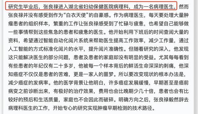 据媒体报道,研究生毕业后,张良禄曾进入湖北省妇幼保健医院病理科。不过,明确方向之后,张良禄毅然辞去病理科医生的工作,开始专心的研究实现肿瘤早期检测的技术路径。